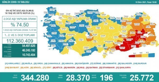 Buna göre; Türkiye'de son 24 saatte 344 bin 280 Kovid-19 testi yapıldı, 28 bin 370 kişinin testi pozitif çıktı, 196 kişi hayatını kaybetti.