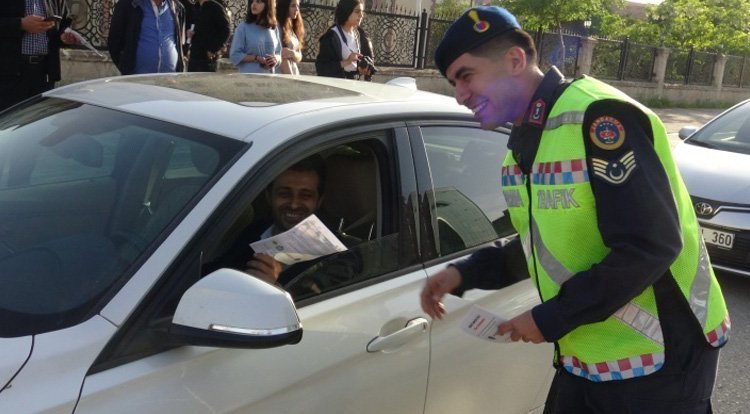 Midyat İlçe Emniyet Müdürü Esma Zeyrek Şirin, beraberindeki polis ve jandarma trafik ekipleriyle birlikte Cumhuriyet Bulvarında, Ramazan Bayramı öncesinde 'Bayramınız kemerli olsun' yazılı broşür, dağıttı.