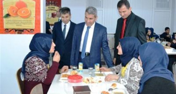 ğrencileri okul yemekhanesinde ziyaret eden Sarı, öğrencilerle birlikte yemek yedikten sonra okulun konferans salonunda öğrencilere hitap etti.